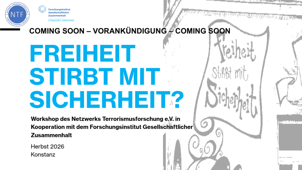 Das Netzwerk Terrorismusforschung e.V. (NTF) ist eine unabhängige Plattform für Forschung, Medien, Behörden und Politik, um die Themenkomplexe Terrorismus, Extremismus, politische Gewalt und Prävention auszuloten. Das zentrale Format des NTF sind die zweimal im Jahr stattfindenden Workshops zu aktuellen Fragestellungen aus dem Themen- und Forschungsbereich Radikalisierung, Extremismus, Terrorismus und Prävention. Neben Fachleuten und Wissenschaftler:innen, die zum jeweiligen Thema arbeiten und forschen, sind insbesondere promovierende Wissenschaftler:innen und auch Masterstudierende dazu eingeladen, ihre Projekte, Arbeiten und Thesen vorzustellen..